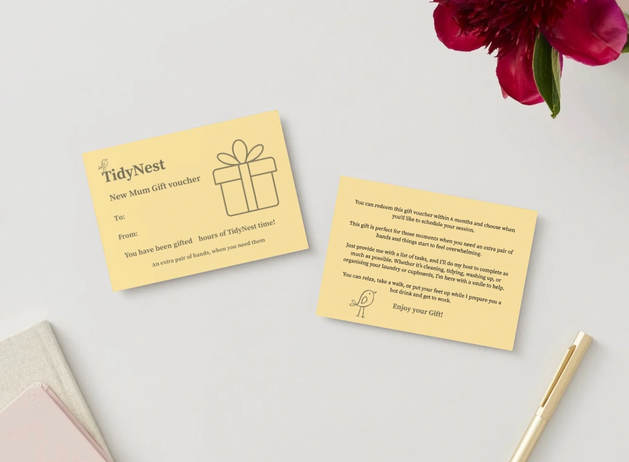 Let's get their feet up! You can choose the amount of time you would like to gift to your loved one. The gift can be personalised and sent via email or presented as a double-sided card with an envelope. It can be delivered either to you or directly to the recipient, along with a leaflet about Nicki and TidyNest services.
